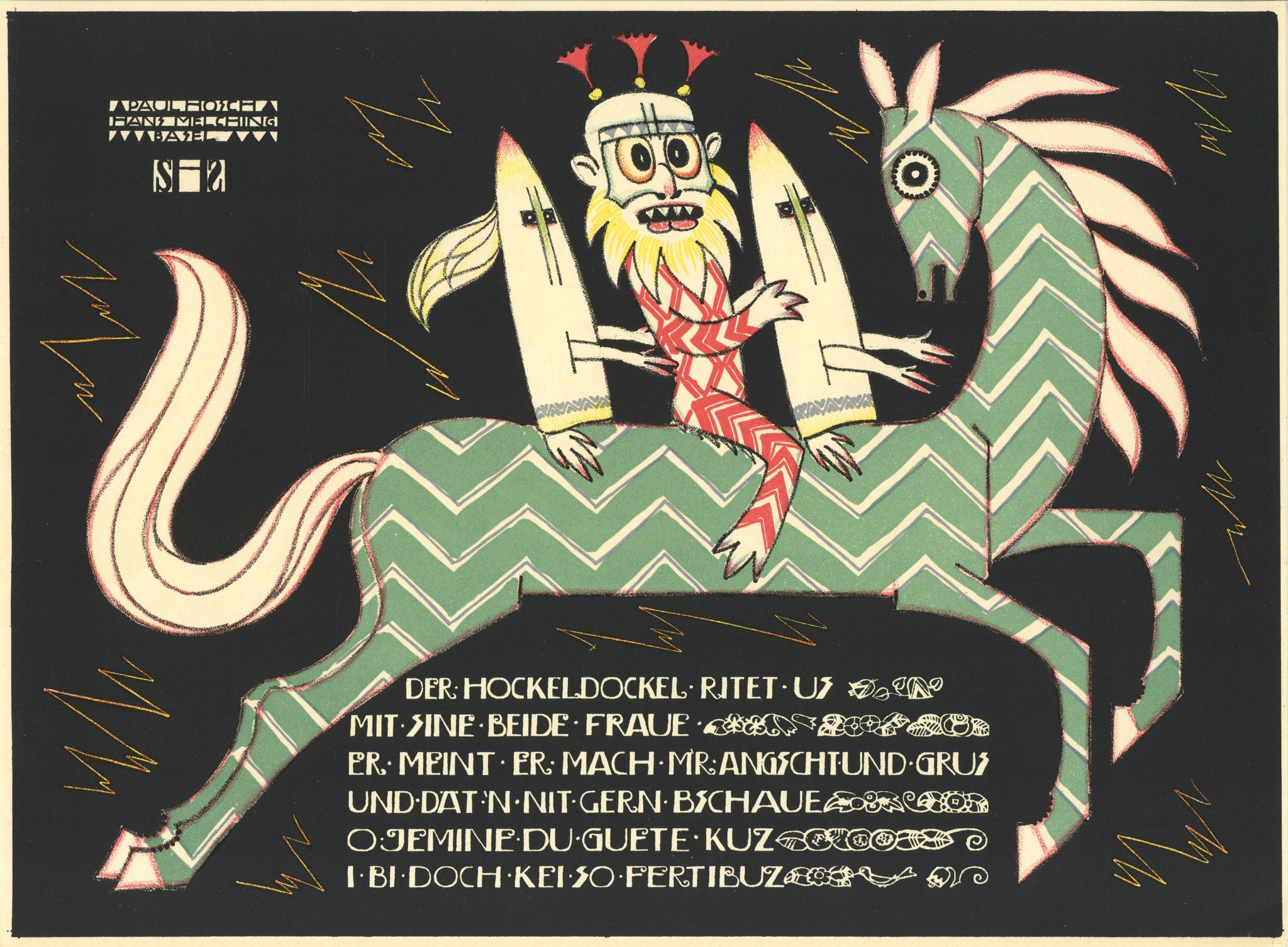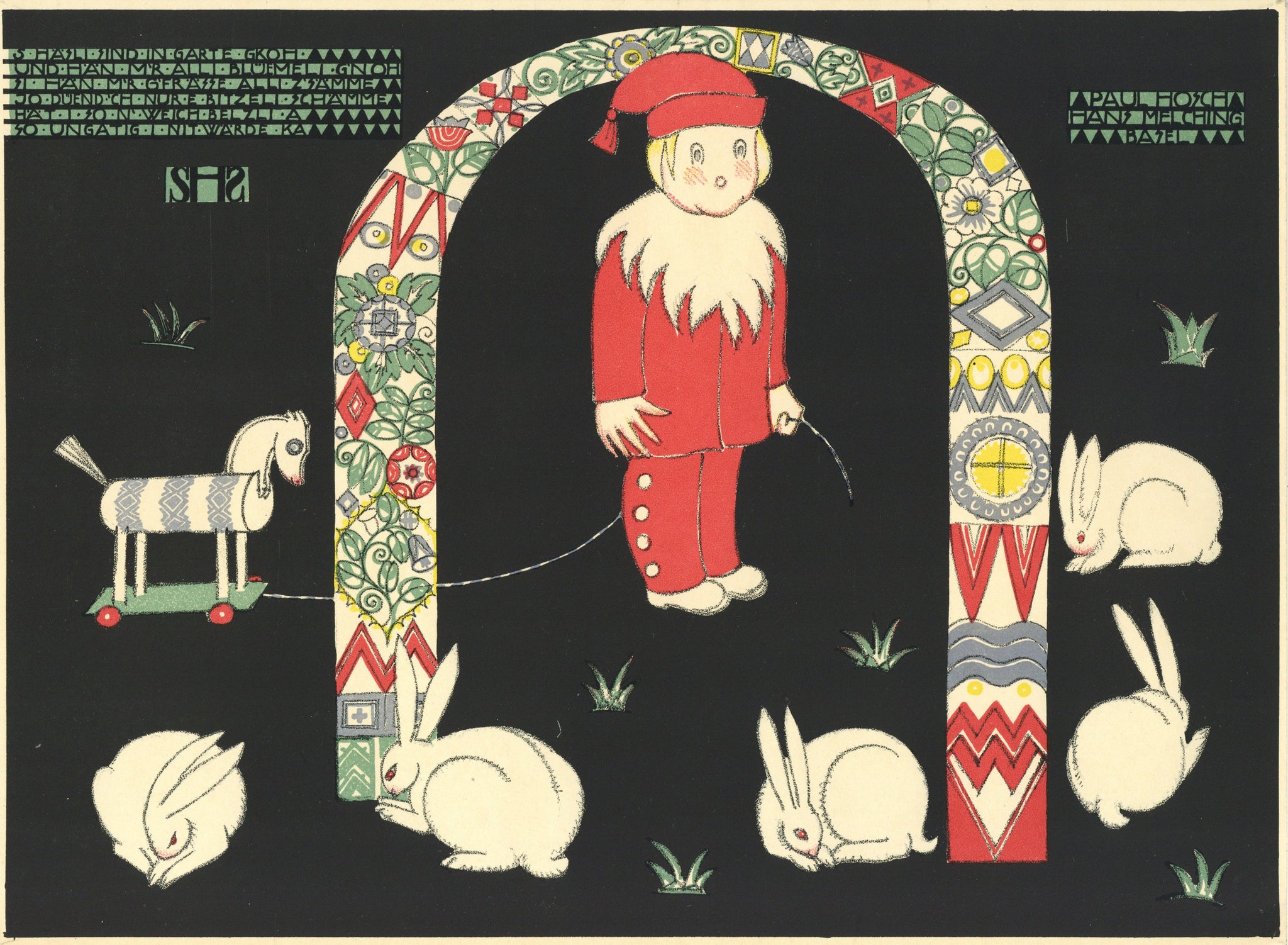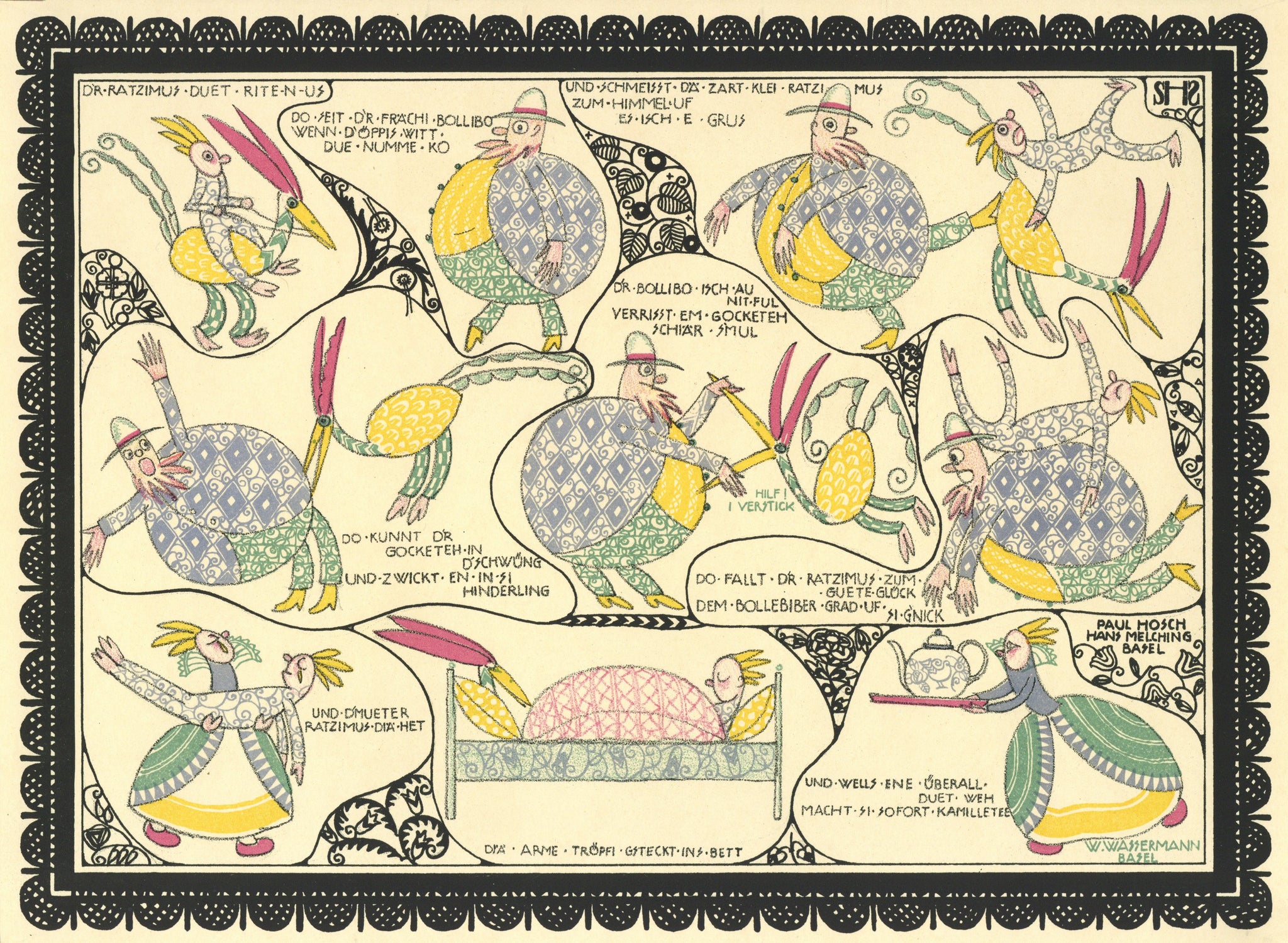 (Swiss Children's Books) Hosch, Paul and Melching, Hans. D'R LUSCHDIG ZIPITI UND SINI SCHBEZEL. 8 FARBIGI BILDERBOGE (ORIGINAL SCHTEIZEICHNIGE) MIT "LEHRREICHE REIMCHE." Basel: Verlag: Wepf Schwabe & Co., [1915]. FIRST EDITION, FIRST PRINTING. Eight 9-13/16" x 13-3/8" color lithographed plates in the style of the Vienna Secession (Wiener Werkstatte), with calligraphic Basel German text within the image on each plate; each plate telling a short children's story told in both pictures and words; all plates in as new condition for what is an amazingly nice copy of the book. The eight lithographed plates loose in original publisher's color pictorial lithographed folding cover as issued, with titles printed in black, and with light rubbing around the edges for what is a bright and clean, and really nice example of the original color lithographed folding cover. The condition of the eight lithographed plates is FINE. The condition of the original color lithographed portfolio is NEAR FINE. Only two copies located on OCLC/WorldCat (Princeton University Library; Universitatsbibliothek Basel). EXCEEDINGLY RARE. Note: This book has been described as "one of the most beautiful Swiss children's' books" (Kaiser, Swiss Picture Books, p. 33). #001013