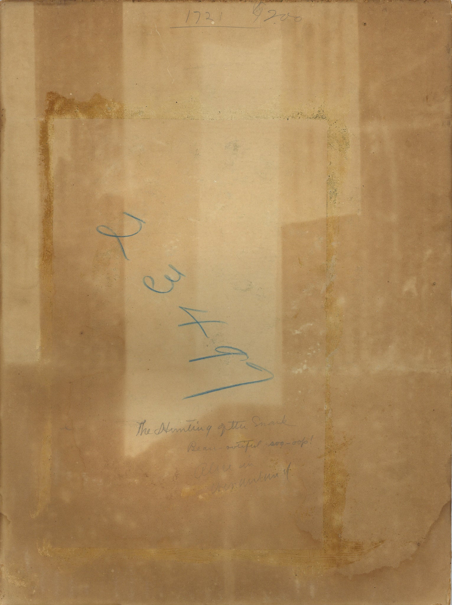 (Newell, Peter). ORIGINAL INK AND WATERCOLOR DRAWING BY PETER NEWELL, PUBLISHED IN LEWIS CARROLL'S, THE HUNTING OF THE SNARK AND OTHER POEMS AND VERSES. Carroll, Lewis. The Hunting of the Snark and other Poems and Verses; with 40 illustrations by Peter Newell. New York and London: Harper & Brothers Publishers, [1903]. Ink and watercolor on paper measuring 7-1/16" x 11-1/16", mounted to board measuring 11-11/16" x 15-5/8"; signed "PETER NEWELL" lower right. Newell's illustrations for "Alice's Adventures in Wonderland" (1901), "Through the Looking-Glass" (1902), and "The Hunting of the Snark" (1903), a nonsense poem, are some of the most original interpretations of these three classics written by Lewis Carroll, the pen name of Charles Lutwidge Dodgson. The whimsical and hilarious drawing offered in this listing, appears facing page 170 in "The Hunting of the Snark" with the caption, "Beau - ootiful soo - oop! Beau - ootiful soo - oop!" It illustrates the poem "Turtle Soup" that appears on page 171 in the book. The condition of the drawing is VERY FINE. Note: This is the only original artwork from this book to ever appear on the market and the piece is really quite wonderful. #001035