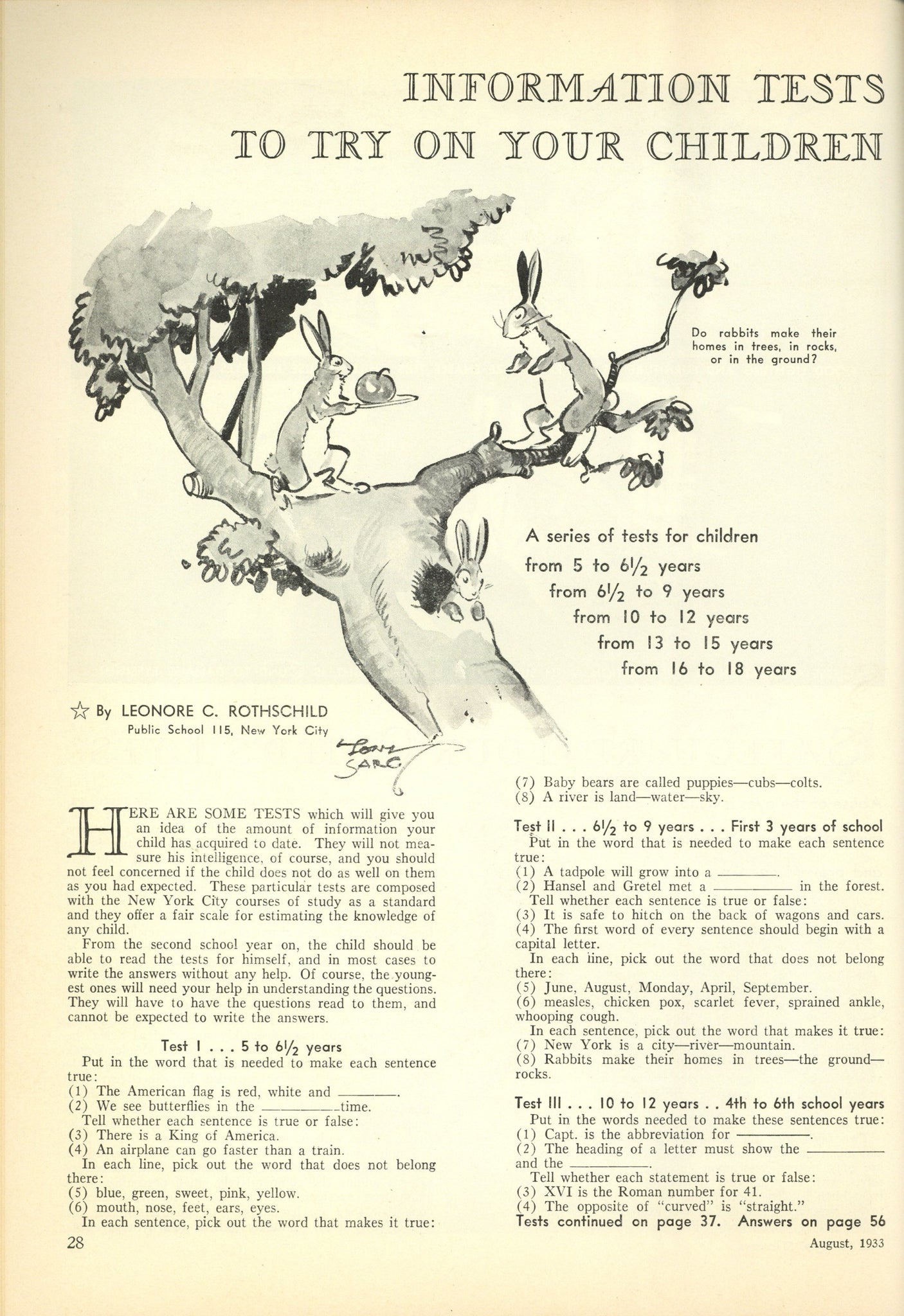 Sarg, Tony. ORIGINAL PEN, INK AND WATERCOLOR DRAWING BY TONY SARG. Chicago: The Parents' Publishing Association, Inc., 1933. This watercolor drawing which is captioned "Rabbits live in trees!" measures 7-1/2" x 8-13/16" on an 11-3/8" x 10-1/2" sheet of drawing paper. The drawing features the aforementioned rabbits happily going about their business high up in a tree! This drawing was published on page 28 of the August 1933 issue of The Parents' Magazine illustrating a section named "Information Tests To Try On Your Children;" Sarg was a regular contributor to The Parents' Magazine throughout the 1930's and early 1940's; drawing is signed by Sarg at lower left; various printer's notations and finger marks to the margins. The condition of the drawing is NEAR FINE. Included with the drawing is a copy of the August 1933 issue of The Parents' Magazine where the drawing was originally published. #000939